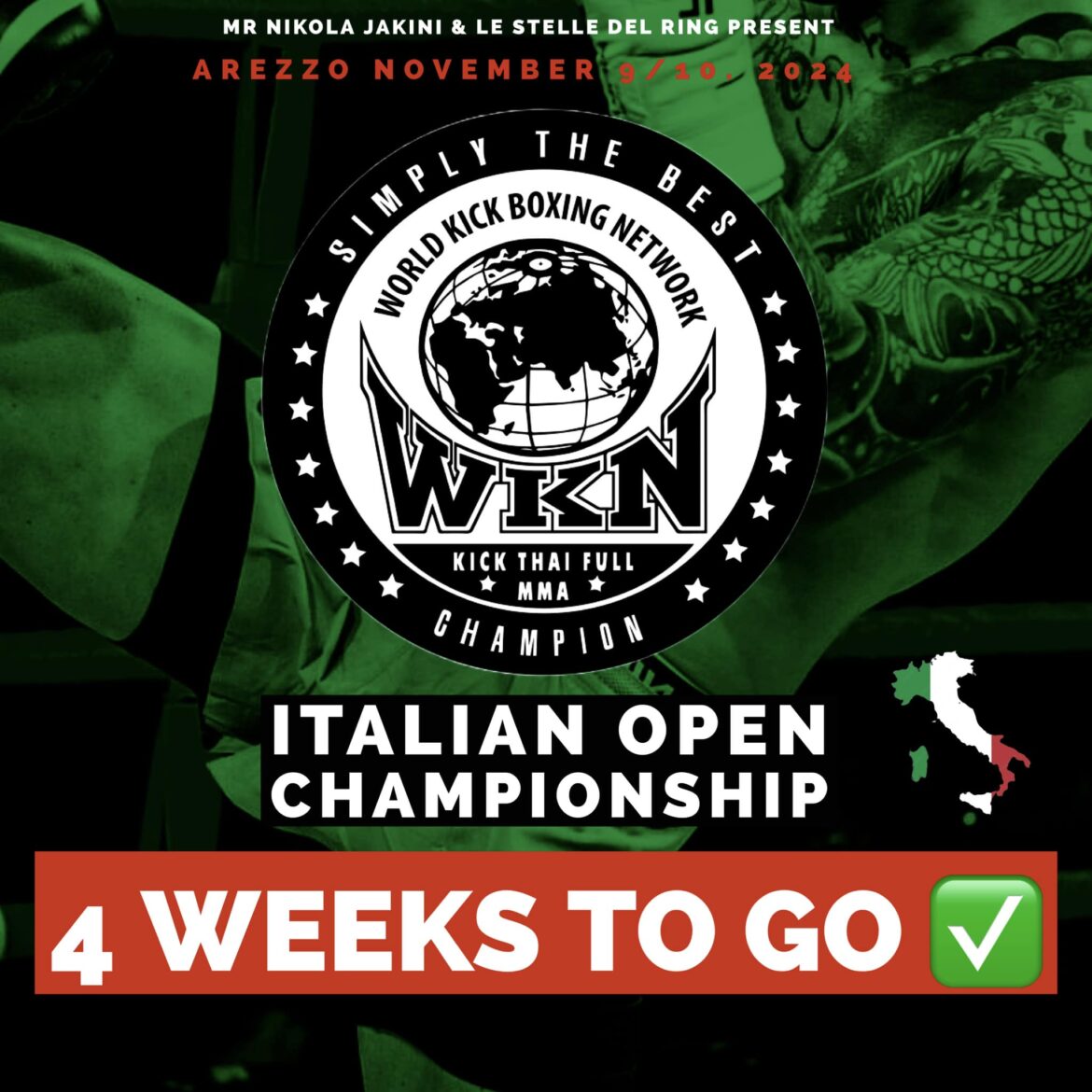 The WKN is extremely proud to host this inaugural Italian Open Championship, which is open to all clubs and fighters, both Italian and foreign, currently based in Italy for over three years.