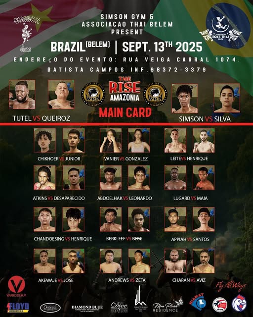 The World Kickboxing Network is proud to officially sanction “The Rise Amazonia”, taking place on September 13th, 2025, in Belém, Brazil. This unique event brings together two nations of fighting spirit: Brazil vs Suriname under the joint promotion of Luciano Cardoso (Brazil) and former WKN champion Angelo Simson (Suriname), with the crucial support of our Suriname coordinator.