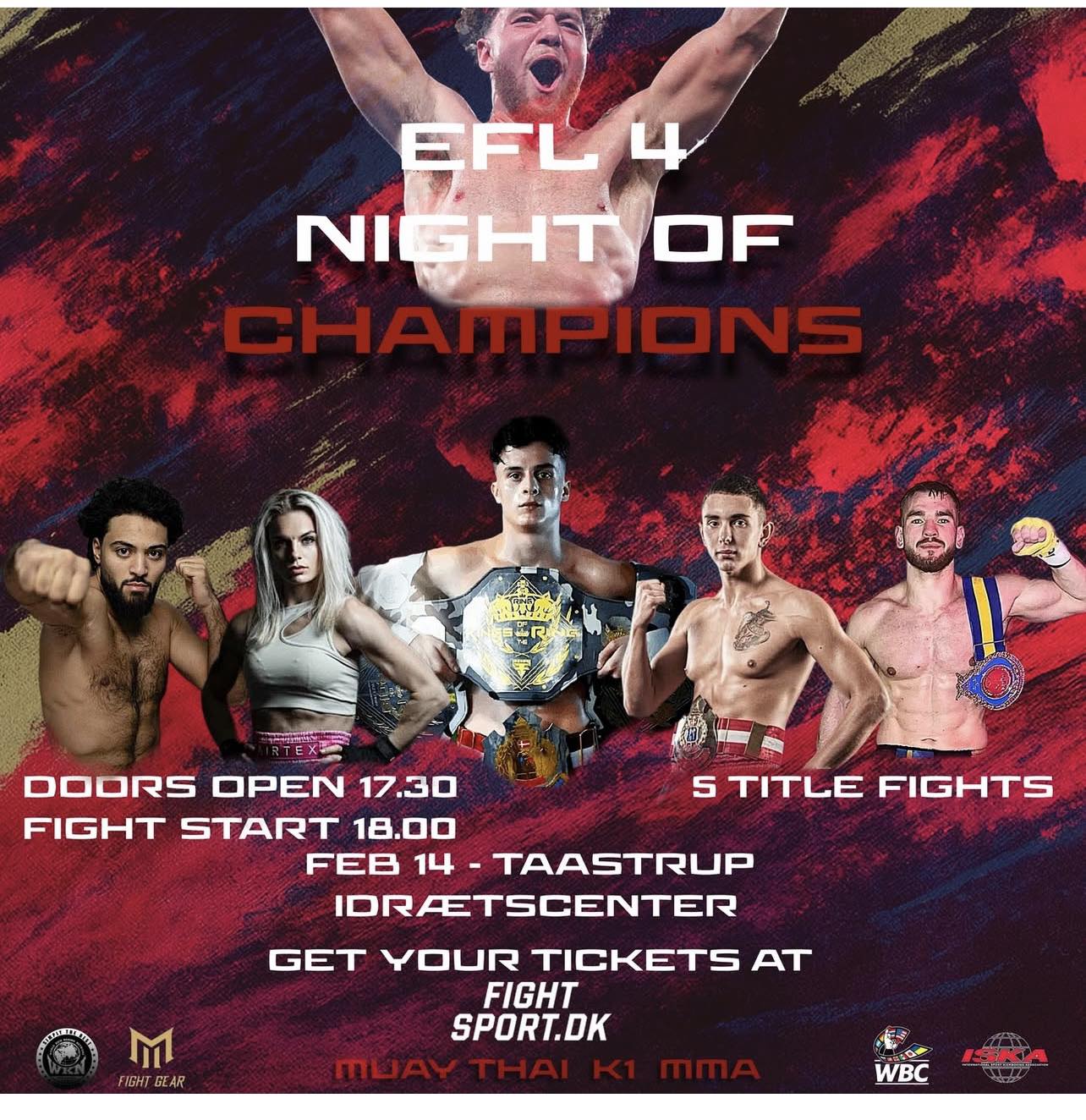 The WKN is proud to announce its continued collaboration with EFL for the upcoming “EFL 4: Night of Champions” in Taastrup, Denmark. As a global leader in combat sports sanctioning, the WKN is always honored to return to Danish soil to oversee high-caliber championship bouts.