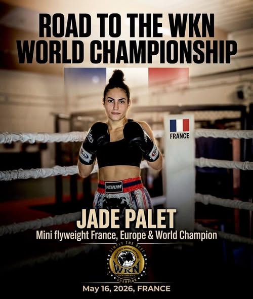 Jade Palet, a highly skilled French fighter of outstanding level, is currently finalizing negotiations for a WKN world championship bout scheduled to take place in France on May 16. She represents a serious team and is backed by a professional promotional organization determined to bring her into the spotlight.