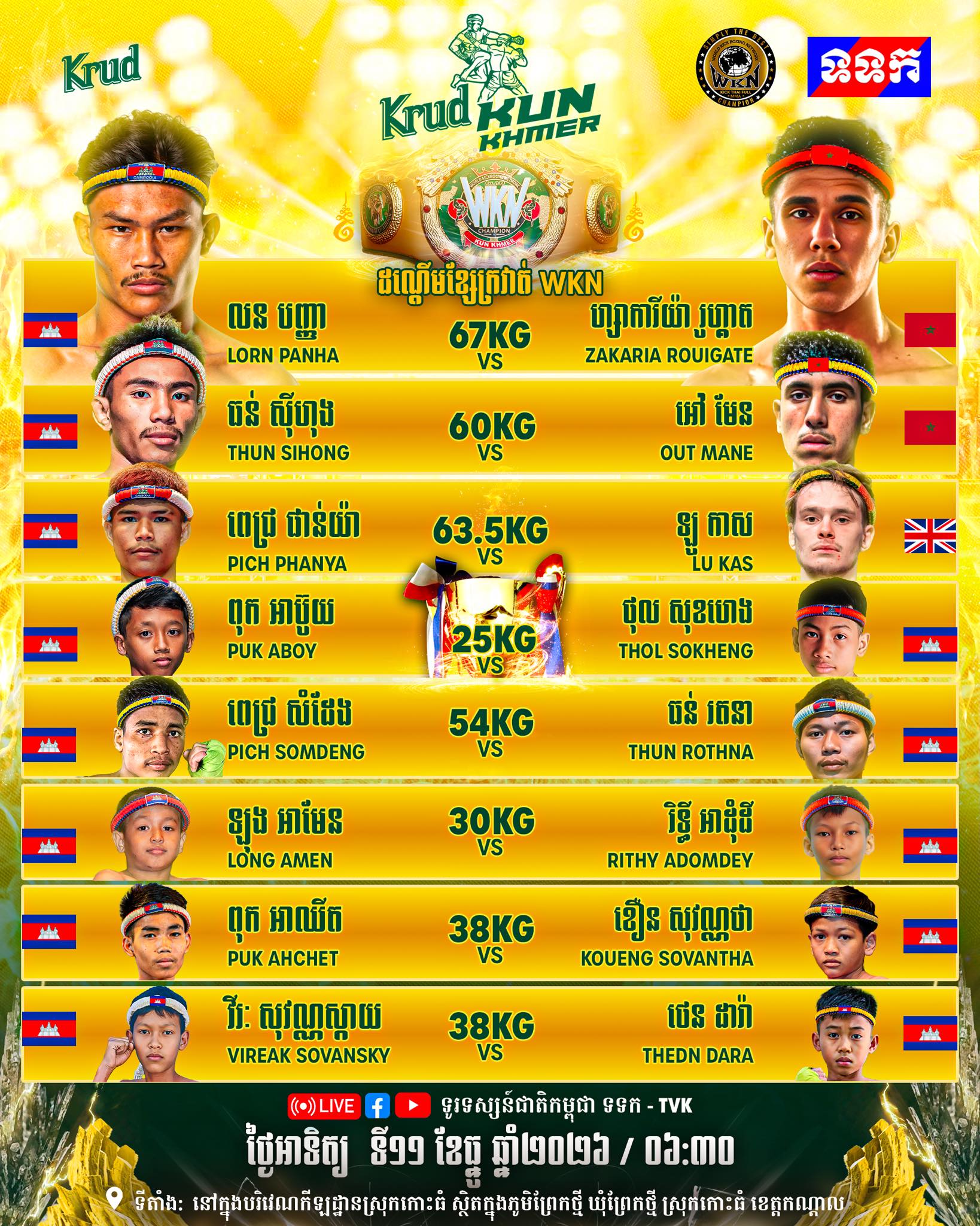 At the end of this landmark night, the first-ever WKN Krud Kun Khmer World Champion will be crowned, symbolizing the official entry of this discipline into the international combat sports elite.